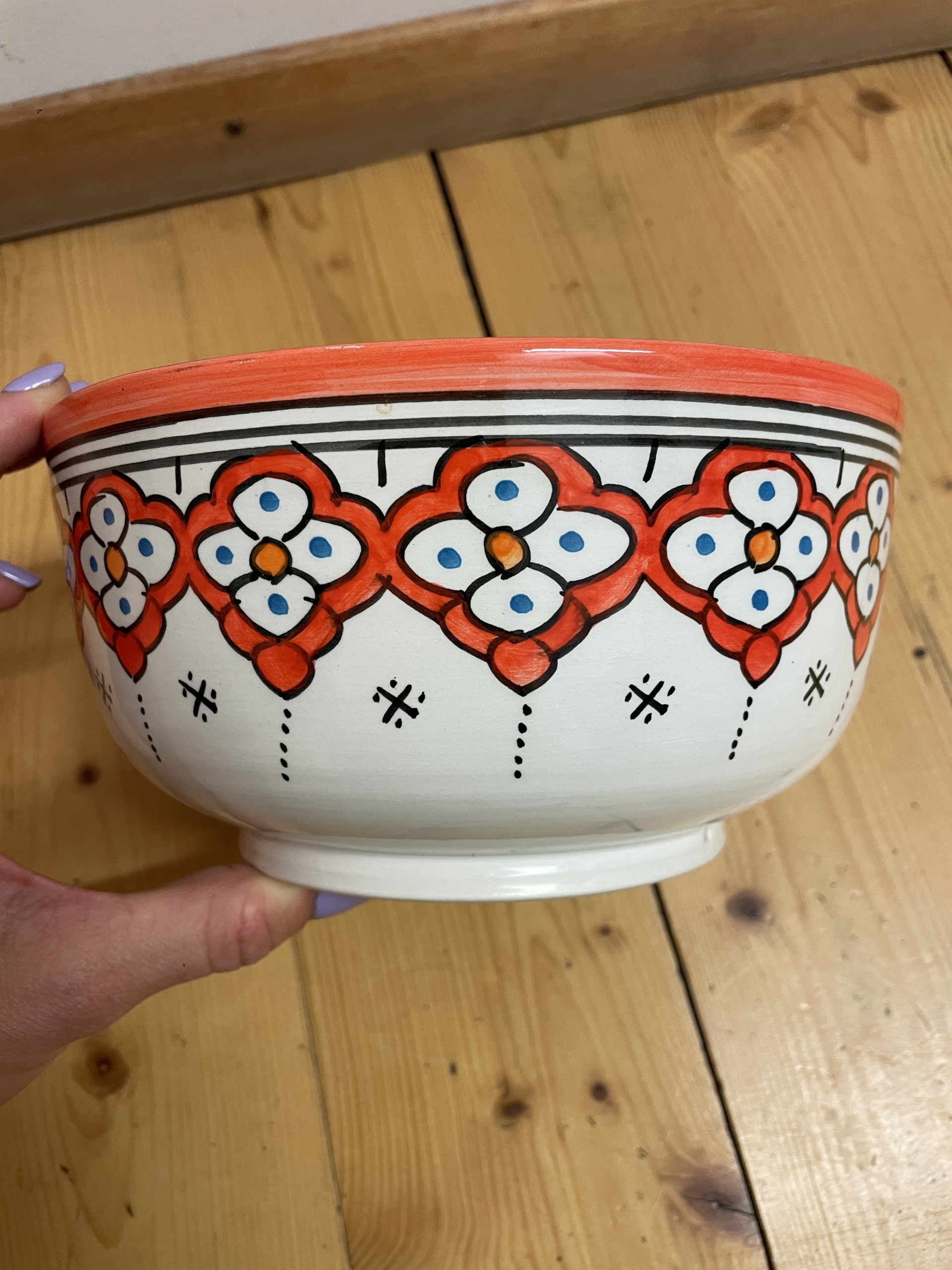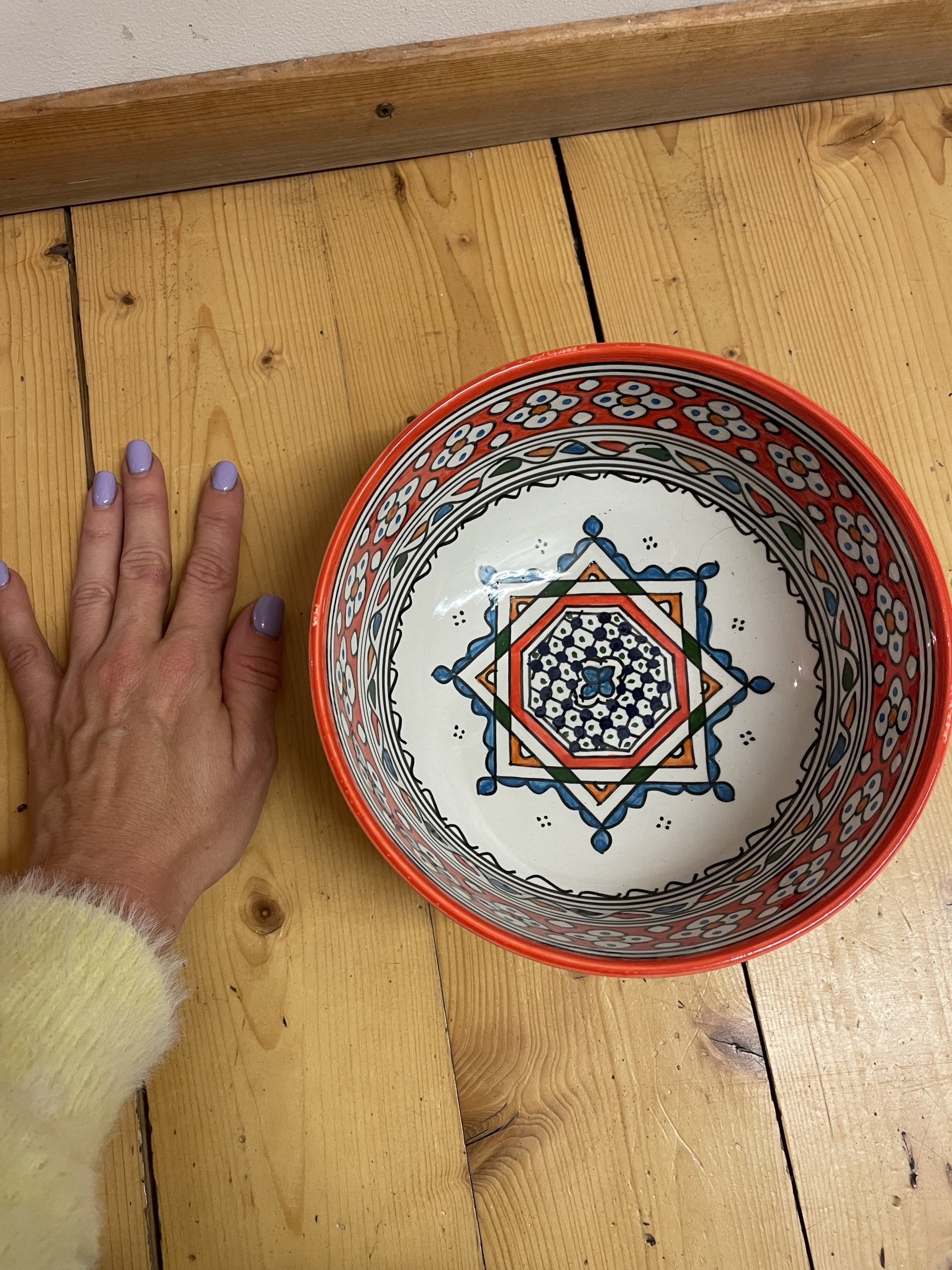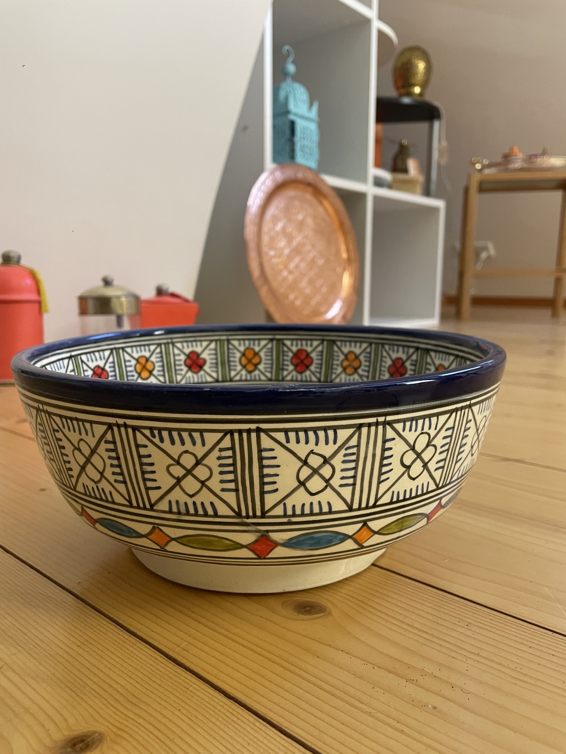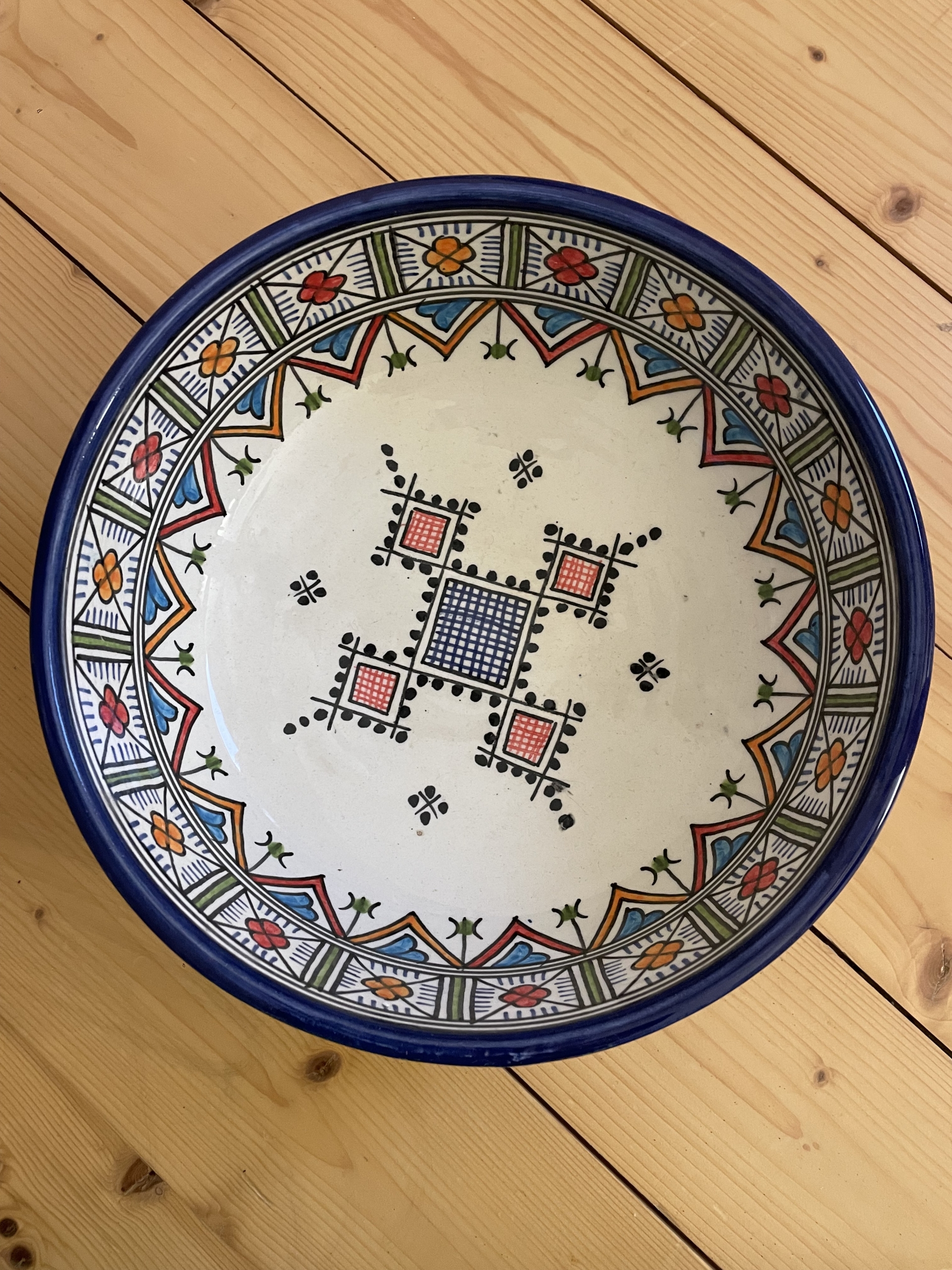 Egal ob als Früchteschale, Salatschüssel oder einfach als Dekoration unsere stilvolle Schüssel peppt jedes Essen und jede Küche auf. Sie wurde von Hand und mit viel Liebe in Fès (Marokko) getöpfert und bemalt. Jedes Exemplar ist ein Unikat.